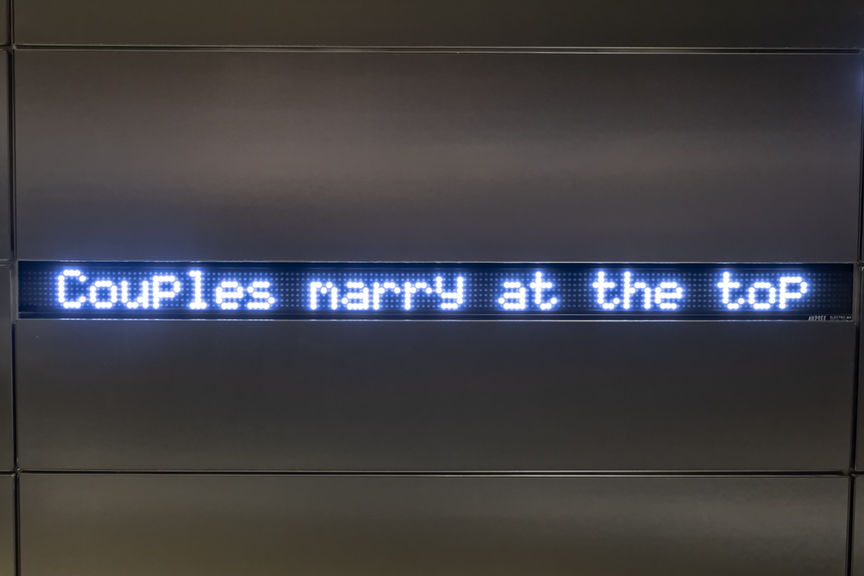 Since we were at the Arch anyway, the family of course took a ride to the top. While waiting in line to board the tram, streaming LED signs on the wall feed you tidbits of information, interesting or useless as you prefer. One passenger didn't give a hoot about the data and just wanted to get on with the ride.