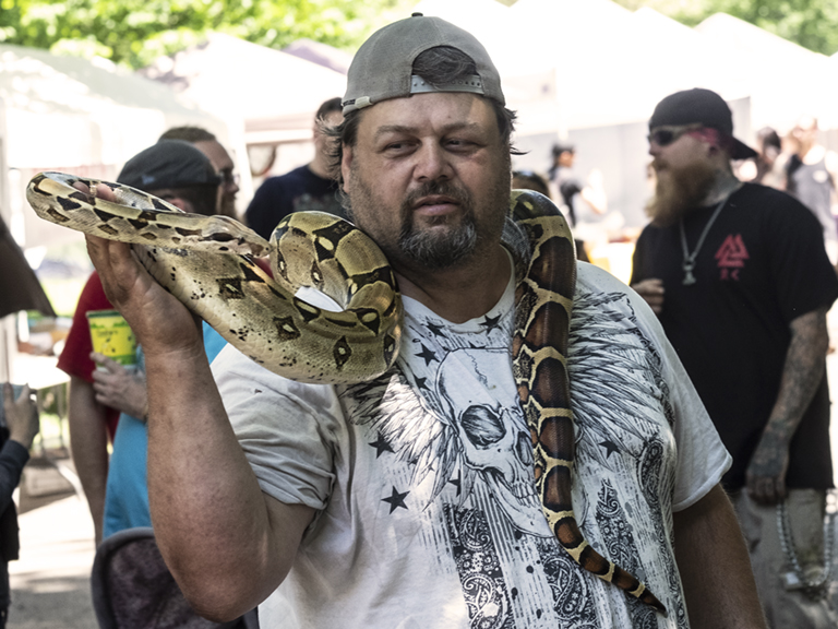 Monty Python's Flying Circus? At least I think it's a python. This person was walking around the central area of the Pagan Picnic last weekend. These creatures are pretty tame, at least when they are not hungry. The owner let kids pet it and adults put it around their necks. Even my granddaughter Ellie likes to play with them. Personally, I'd pass. However, I love the snake's burnished golden color and beautiful patterns. How do genes accomplish that?