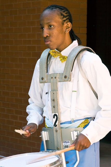 At the end of the Annie Malone parade last weekend, some participants hung out on the side streets, keeping the beat going and thumping it off the surrounding office buildings. This young man was with a group of percussionists and dancers in the courtyard of Louis Sullivan's Wainwright Building. It is of great architectural significance, being one of the first couple of steel-framed skyscrapers in the world. (Eleven stories was a skyscraper in 1890.) These kids put on a great improv dance show for their own pleasure but I was fascinated by this young man's disengagement. I liked his crooked yellow bow tie and the way the light played off his face, too.TOMORROW: Poker Face